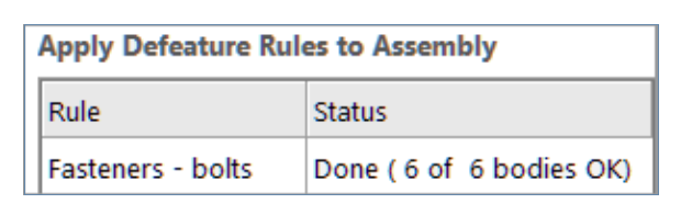 您可以将已保存的 Defeature 规则集用于其他模型。日志文件会显示将 Defeature 规则集应用到模型的结果。日志文件包括状态为正常或故障的零部件列表。